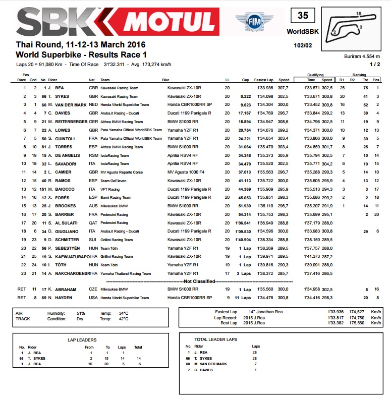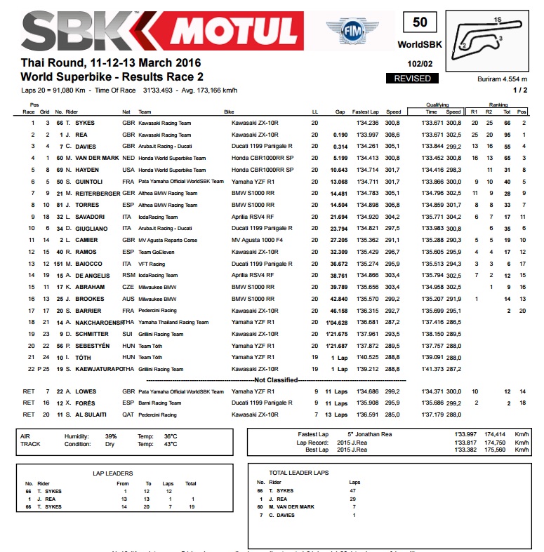 Prvu startnu poziciju na Chang stazi u Tajlandu osvojio je Vd Mark na Hondi, koji je relativno loše startao, ali se svejedno uspio držati Kawasakijevog dvojca, sve dok umalo nije pao i procijenio kako mu je ipak bolje držati treće mjesto i doći do trećeg podija u isto toliko utrka. Tako su iz njegova vidokruga postupno nestajala dva zelena Kawasakija, pri čemu se sve odigralo po dosta predvidljivom scenariju. Dakle, Sykes je vodio skoro cijelu utrku, dok ga je Rea pratio u stopu i uzimao mu mjeru, prije negoli ga uspješno napao nekoliko krugova prije kraja i nastavio niz nepobjedivosti. Jedino iznenađenje je to što ga je Sykes uspio pratiti do samog kraja pa je tako prošao ciljem sa samo dvije desetinke zaostatka, pokazavši da je možda izgubio (i ovu) bitku, ali da još traje rat.
