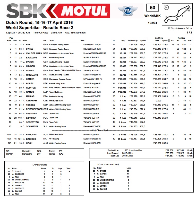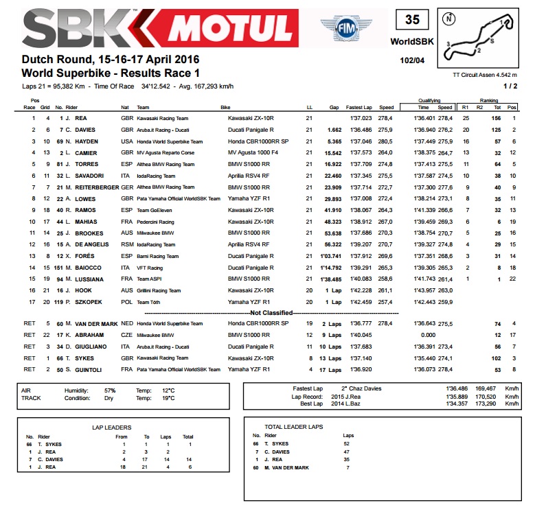 Iako je imao veliki zaostatak, Vd Mark je razveselio nizozemsku publiku osvajanjem trećeg mjesta, dok je Savadori prošao ciljem kao četvrti, što je najbolji rezultat Aprilije u dosadašnjem dijelu sezone. Davies je s Ducatijem završio kao 5., što je bilo i više nego dovoljno da zadrži drugu poziciju u ukupnom poretku, ali sada mu vodeći Rea bježi ozbiljnih 45 bodova.