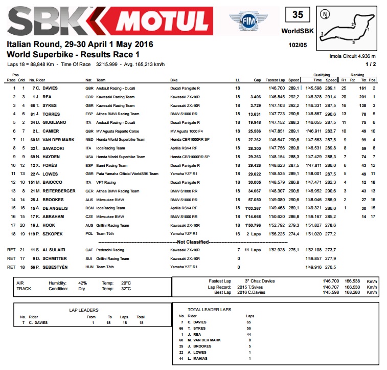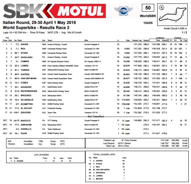 Nakon što je prošle godine u Imoli dvaput odustao zbog kvarova, ovaj put je Davies došao do dvostruke pobjede na stazi koja se nalazi praktično u Ducatijevom dvorištu. I pritom nije samo pobjeđivao, nego je, nakon što je bio najbrži na kvalifikacijama, u obje utrke odradio i najbrži krug te vodio od prvog do posljednjeg metra,