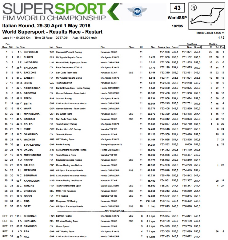 Supersport utrka je prekinuta u ranoj fazi nakon problema s agregatom na Kawasakiju Randy Krummenachera, koji nije mogao krenuti u ponovljenu utrku u trajanju samo 11 krugova, te je tako bez borbe izgubio vodstvo u ukupnom poretku od svog timskog kolege Sofuoglua. On je nakon starta bio drugi, ali se brzo probio ispred Cluzela na MV Agusti, koji je nakon toga potonuo i na treće mjesta iza Jacobsena na Hondi. Cluzel se nakon nekog vremena ipak ponovo probio ispred Jacobsena, koji je na kraju završio kao treći, i započeo lov na Sofuoglua, no na kraju je ipak ostao kratak.