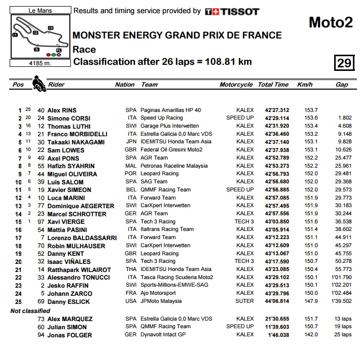 U klasi Moto2 je najbolje krenuo Luthi, no prvo ga je obišao Rins, a onda i Corsi, tako da je Švicarac završio kao treći. Ispred njega je Corsi dugo držao priključak da bi Rins u završnici utrke ipak bio primjetno brži te je tako odnio svoju drugu pobjedu ove sezone i preuzeo vodstvo u ukupnom poretku od Lowesa, koji je završio kao šesti. Folger i Zarco su ubilježili padove umjesto bodova te su tako malo izgubili korak s vodećim dvojcem.