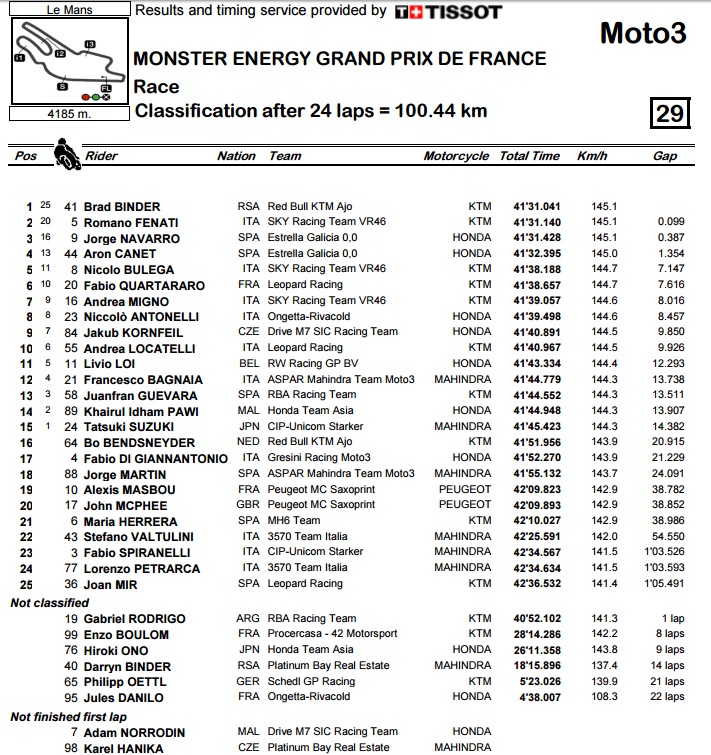 Nakon što je prošli put u Jerezu osvojio prvu pobjedu u Moto3 karijeri, Brad Binder je u Le Mansu došao i do svoje prve uzastopne pobjede s kojom se dodatno odvojio na vrhu poretka. Pritom se cijelu utrku ravnopravno borio sa Fenatijem, obojica na KTM-u, prije nego je projurio ciljem s 99 tisućinki ispred njega, dok je treptaj oka iza njihovih leđa prošao Navarro na Hondi, koji je u posljednji tren nadmudrio novajliju i timskog kolegu Caneta.