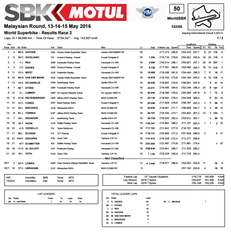 Superbike karavana je i ove godine navratila u Sepang, no ovaj put je bilo i dosta nepoznanica u igri budući je malezijska staza bila netom presvučena novim asfaltom, pri čemu su donekle promijenjeni i neki od zavoja. Oborivši rekord već u drugom krugu subotnje utrke, Sykes je pokazao da se savršeno prilagodio ispeglanoj stazi, što je onda i dodatno potvrdio time što ga nije uspijevao pratiti ni timski kolega i aktualni svjetski prvak Rea, koji je u konačnici zaostao nešto više od 5 sekundi.