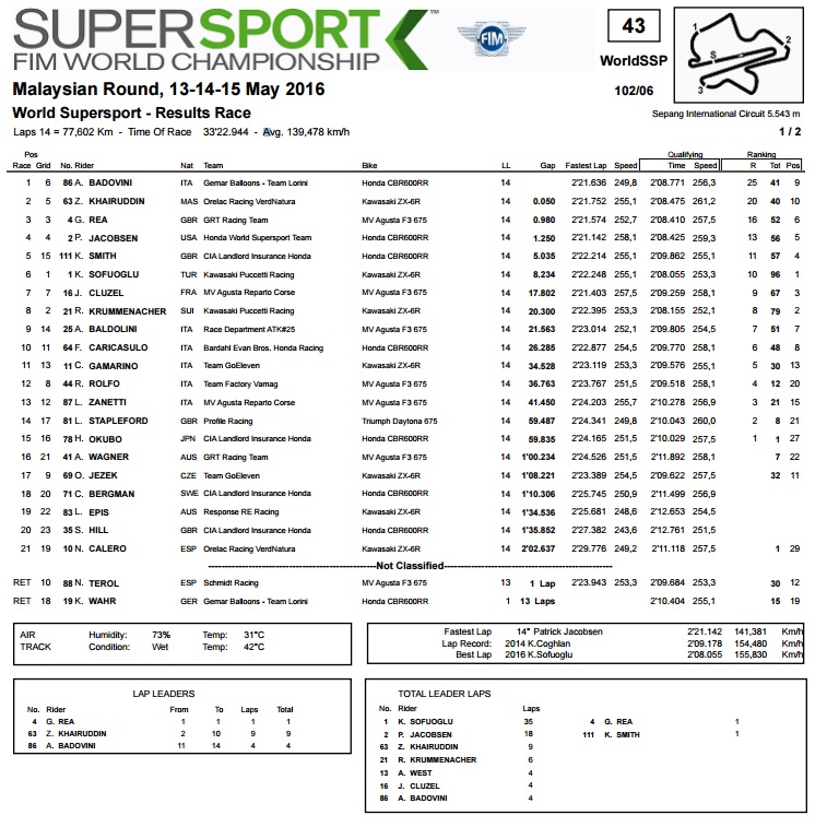 Zbog jake jutarnje kiše Supersport utrka je bila pomaknuta iza nedjeljne Superbike utrke, a u takvom se kasnijem terminu i na asfaltu koji se sušio na kraju najbolje snašao Badovini na Hondi. Pritom je slomio srce gledateljima na stazi budući je u posljednjem zavoju obišao lokalnog heroja Khairuddina na Kawasakiju, prošavši ciljem samo 5 stotinki ispred njega, a unutar sekunde za pobjednikom završio je i Gino Rea na MV Agusti, dok je Jacobsenu na Hondi podij izmakao za četvrtinu sekunde. Sofuoglu nije imao dobar dan, posebno nakon što je u završnici utrke predao 5. poziciju Smithu, no vozač Kawasakija je ipak povećao vodstvo u ukupnom poretku budući su Cluzel (MV Agusta) i Krummenacher (Kawasaki) završili 7. i 8.