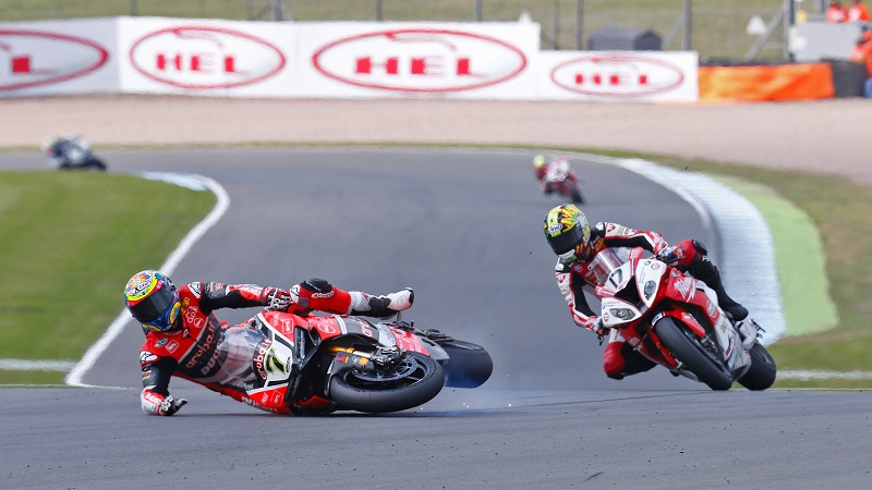 Subotnju utrku u Doningtonu su uvelike režirale pogreške vozača u vodećoj grupi koju su činili prvotimci Kawasakija i Ducatija. Poveo je Davies na Ducatiju, a prvi pogriješio Sykes na Kawasakiju, koji je tako potonuo na četvrto mjesto. Zatim je pogriješio Davies, koji je odsklizao sa staze, pa je vodstvo preuzeo njegov timski kolega Giugliano, kojeg su uporno proganjala dvojica vozača Kawasakija. Davies je još jednom pao, i ovaj put odustao, dok je Rea pogriješio i izgubio pet sekundi za vodećim dvojcem.