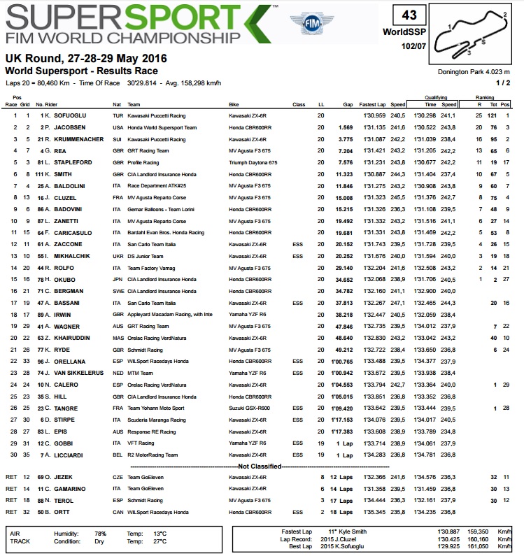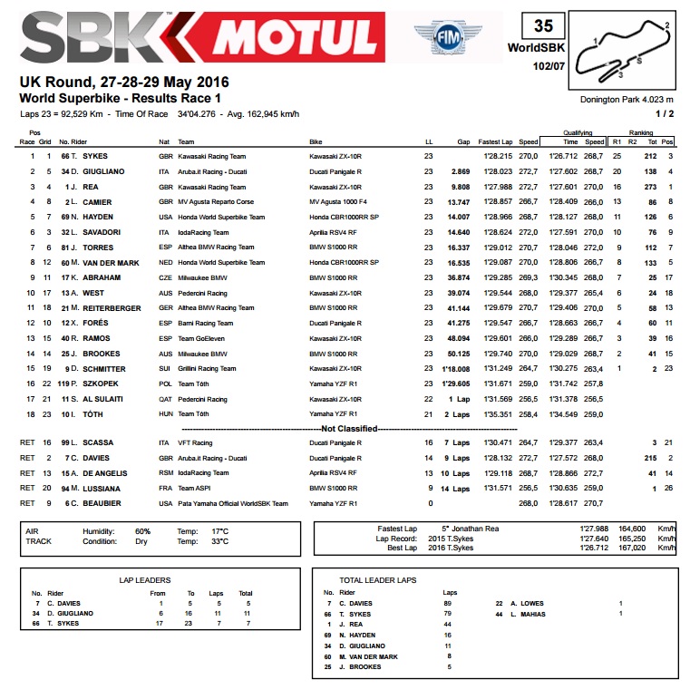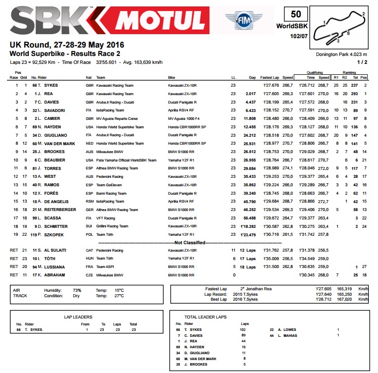 I u nedjeljnoj utrci je slavio Sykes, što mu je bila osma uzastopna pobjeda u Doningtonu, k tome i u potpunosti zaslužena budući je u svakom od 23 kruga ciljem prošao kao prvi. Ipak, Rea mu veći dio utrke nije dao mira, uspio se nakratko i probiti i ispred njega, da bi na kraju završio s 2 sekunde zaostatka. Dodatnih 2 sekunde je zaostao i trećeplasirani Davies, za kojeg je to bio i pretjerano uzbudljiv vikend budući je uz dvostruki pad na subotnjoj utrci ubilježio i iskakanje sa zapaljenog Ducatija na treningu u petak. Samo dvije sekunde iza trećeplasiranog Daviesa utrku je završio Savadori na Apriliji, dok je Camier opet prošao ciljem ispred nosa Haydenu, no ovaj put u borbi za 5. mjesto.