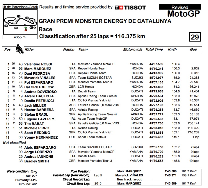 Tako je Rossi došao do svoje 114. Grand Prix pobjede, dok je 4 sekunde iza Marqueza kao treći ciljem prošao njegov timski kolega Pedrosa. On se u ranoj fazi utrke jedva obranio od agresivnih napada Vinalesa, koji je sa Suzukijem na kraju završio na 4. mjestu s velikih 24 sekunde zaostatka. Peto mjesto je zauzeo Pol Espargaro s Tech3 Yamahom, ispred Crutchlova na Hondi i Doviziosa na Ducatiju, dok je pozitivno iznenađenje utrke bio Alvaro Bautista koji je u utrku krenuo s posljednje pozicije, a svejedno se s Aprilijom probio do 8. mjesta.