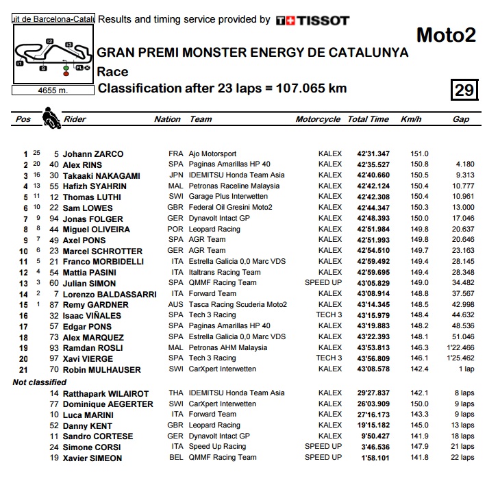 Zarco i Rins su u Moto2 utrci predstavljali klasu za sebe. Pritom je Zarco strpljivo slijedio Rinsa sve do 17. kruga kada je preuzeo vodstvo, da bi nakon toga počeo lagano odmicati i na kraju pobijedio s više od 4 sekunde prednosti. Treće mjesto je veći dio utrke držao Luthi, a iako se oduprijeti napadima Alexa Marqueza koji je ubrzo pao, do kraja utrke su ga ipak uspjeli obići Nakagami, kojem je to bio prvi podij u skoro godinu dana, a onda i Syahrin. Tako je Luthi na kraju završio kao 5., tri sekunde ispred šestog Lowesa, koji je vodeće mjesto u ukupnom poretku prepustio Rinsu, a unutar samo 10 bodova je i trećeplasirani Zarco.