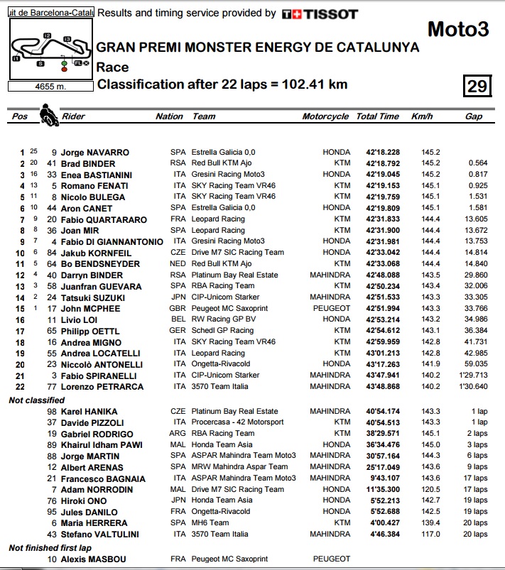 U Moto3 utrci su šestorica vozača završila unutar tek nešto više od 1,5 sekunde, pri čemu je najviše razloga za slavlje ima talentirani Jorge Navarro, koji je s Hondom ostvario prvu pobjedu u karijeru. Ukupno vodeći Brad Binder nije uspio osvojiti 4. pobjedu u nizu, ali je majstorski dograbio 2. mjesto i to nakon što se pet krugova prije kraja Rodrigo zabio u njegov KTM i umalo ga izbacio iz igre. Treće mjesto je osvojio Talijan Bastianini na Hondi ispred svojih zemljaka Fenatija i Bulege na KTM motociklima.