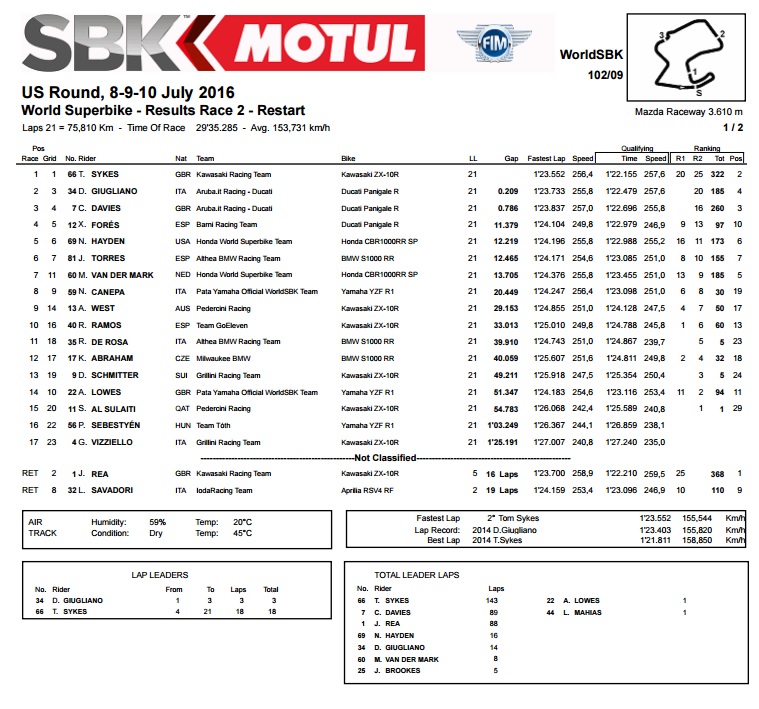 S više od 11 sekundi zaostatka četvrti je ciljem prošao Fores na privatnom Ducatiju, Hayden je ovaj put bio 5., dok je Torres s BMW-om završio šesti ispred VD Marka s Hondom. Budući je Rea odustao, a Sykes pobijedio, razmak između Kawasakijevog dvojca je smanjen na 46 bodova u trenutku kad su do kraja prvenstva ostale još 4 runde, odnosno 8 utrka, od kojih je prva na rasporedu tek sredinom rujna. Kao i obično, u Laguna Seci se nije vozila utrka Supersport prvenstva. Rezultate Superbike utrka u Laguna Seci pogledajte u donjoj galeriji.