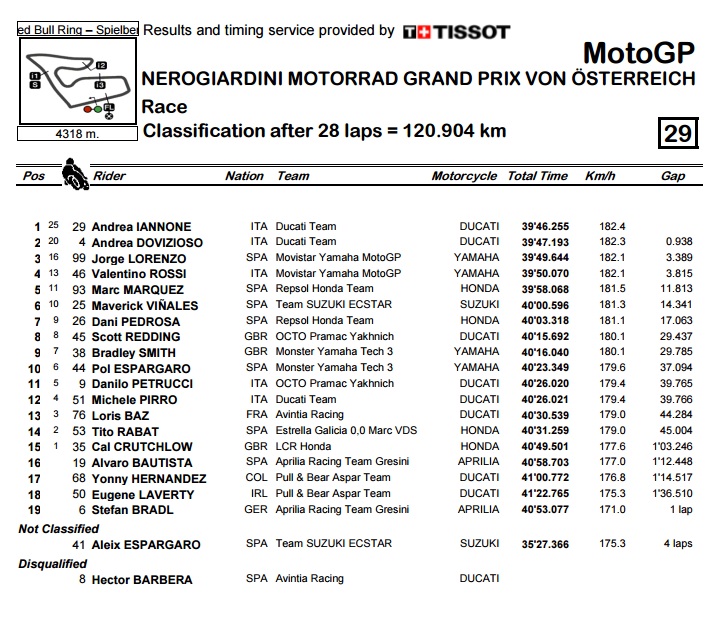 Ako je postojala staza na kojoj se od vozača tvorničkog Ducatija očekivalo da prekinu taj pobjednički post, onda je to bio Red Bull Ring (nekad A1 Ring) koji se nakon skoro dva desetljeća vratio u igru i odmah zauzeo mjesto najbrže staze u kalendaru. Tri dugačke ravnice omogućavale su vozačima Ducatija da iskoriste premoć po pitanju konjskih snaga, koju onda nisu stigli izgubiti u relativno kratkom zavojitom završnom dijelu kruga.