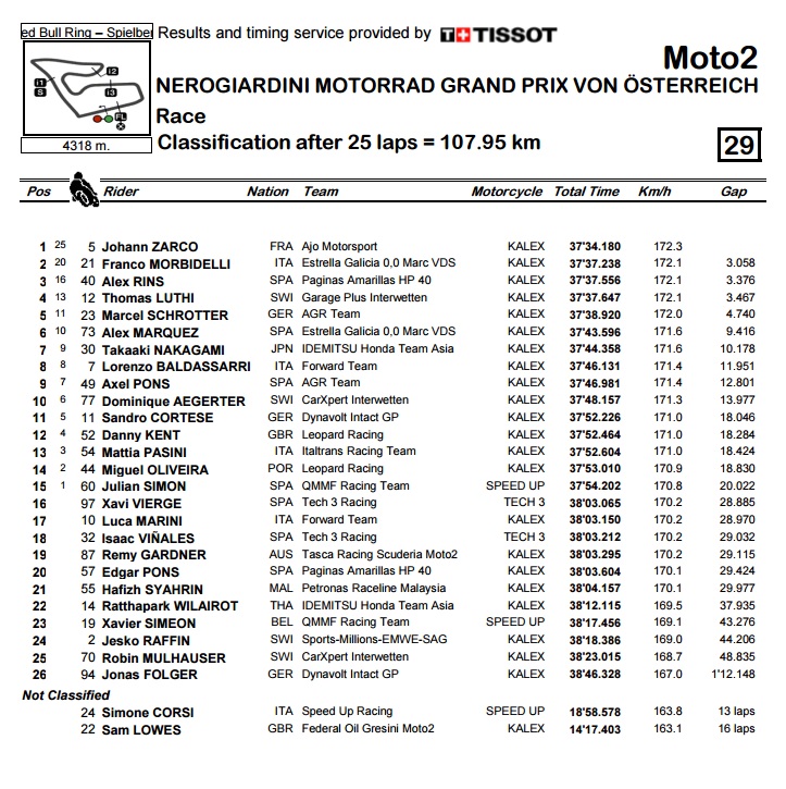 Budući vozač Tech3 Yamahe, Jules Cluzel, je pobijedio u Moto2 klasi. Francuz se strpljivo skrivao u vodećoj grupi da bi 9 krugova prije kraja uzeo vodstvo i odjurio naprijed do četvrte pobjede u pet posljednjih utrka. Drugi je ciljem projurio Morbidelli, dok se Rins u posljednjem zavoju progurao pored Luthija na treće mjesto te tako, iako broji 34 boda zaostatka u odnosu na Cluzela, ostao u borbi za naslov. Isto se vjerojatno više ne bi moglo reći za Sam Lowesa, koji je dva puta pao u istom zavoju i odustao te sada broji minus od 55 boda.