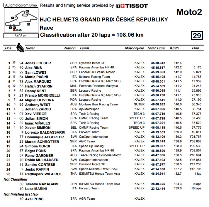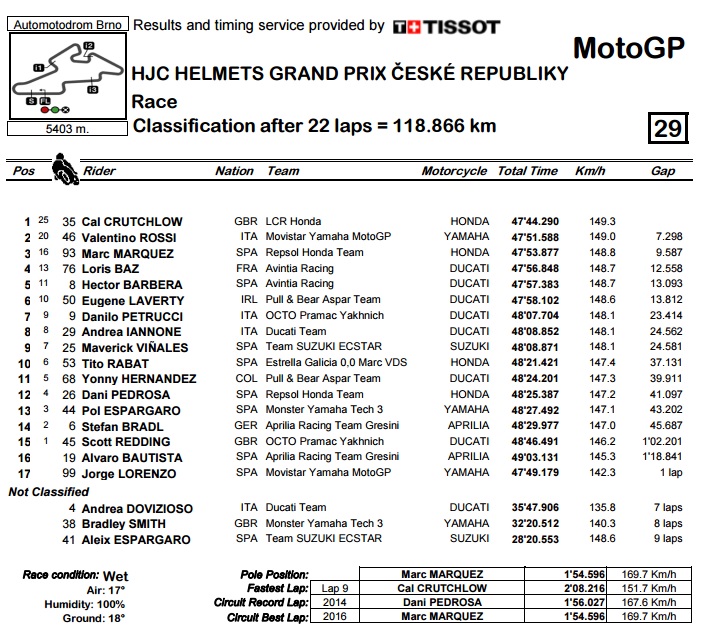 Rossi je u Brnu prije točno 20 godina osvojio svoju prvu pobjedu, tada u klasi 125, a sada je osvajanjem drugog mjesta pokazao kako je još uvijek u vrhunskoj formi. Usput je u ukupnom poretku prestigao Lorenza, kojem se raspala prednja guma, te barem malo smanjio bodovni zaostatak za Marquezom, koji je igrao na sigurno i osvojio treće mjesto. Neposredno iza njega ciljem su prošla dva Avintia Ducatia, pri čemu je Baz sa tvrdim gumama u pretposljednjem krugu projurio pored timskog kolega Barbere na mekšoj smjesi.