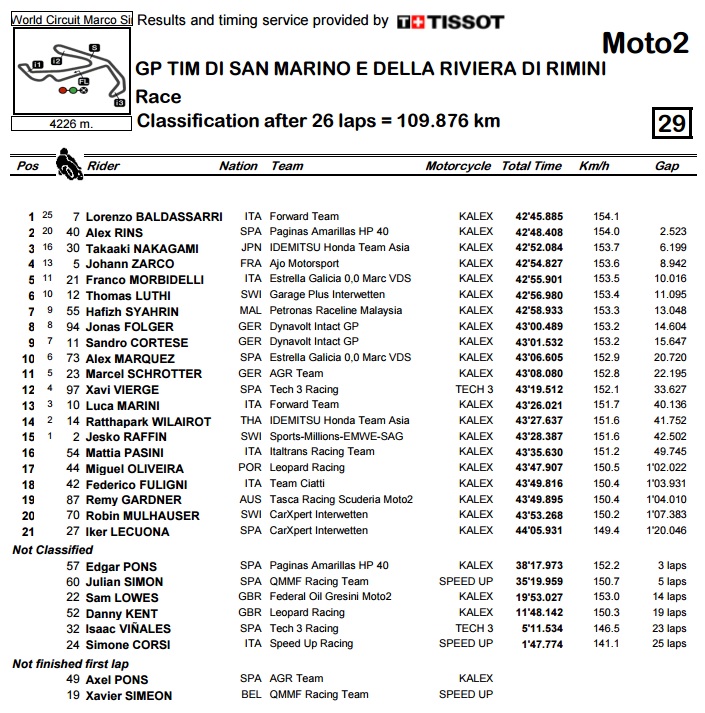U Moto2 klasi se činilo da je Alex Rins na putu do pobjede i preuzimanja vodstva u ukupnom poretku, no u završnici utrke ga je sustigao, pa u pretposljednjem krugu i prestigao Baldassarri. Iako je nedavno slomio ključnu kost, Rins je pronašao dovoljno snage za napad u posljednjem krugu, no Baldassarri je odigrao odličnu obranu i tako došao do prve pobjede u karijeri. Treći je bio Nakagami, a četvrti Zarco, kojem su tako ostala samo tri boda prednosti u odnosu na Rinsa. S druge strane, Lowes je pao sredinom utrke i tako izgubio realne šanse da se bori za naslov.