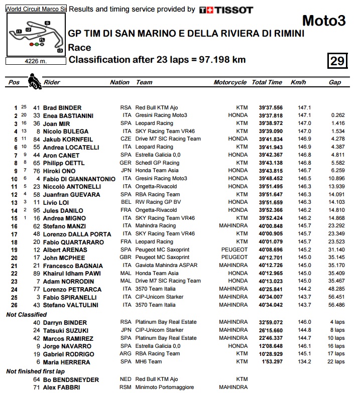 Utrka u Moto3 kategoriji gotovo da je iznjedrila novog svjetskog prvaka. Brad Binder (KTM) se cijelu utrku nadmudrivao s Bastianinijem (Honda) i na kraju izvojevao tijesnu pobjedu, dok je Mir (KTM) u sličnom duelu za treće mjesto bio bolji od Bulege (KTM). Budući je Navaro (Honda) pao, a Bagnaia (Mahindra) završio izvan bodova, Binder je svoju prednost povećao na 106 bodova, što znači kako postoji sasvim realna mogućnost da već na idućoj utrci u Aragonu potvrdi osvajanje naslova.