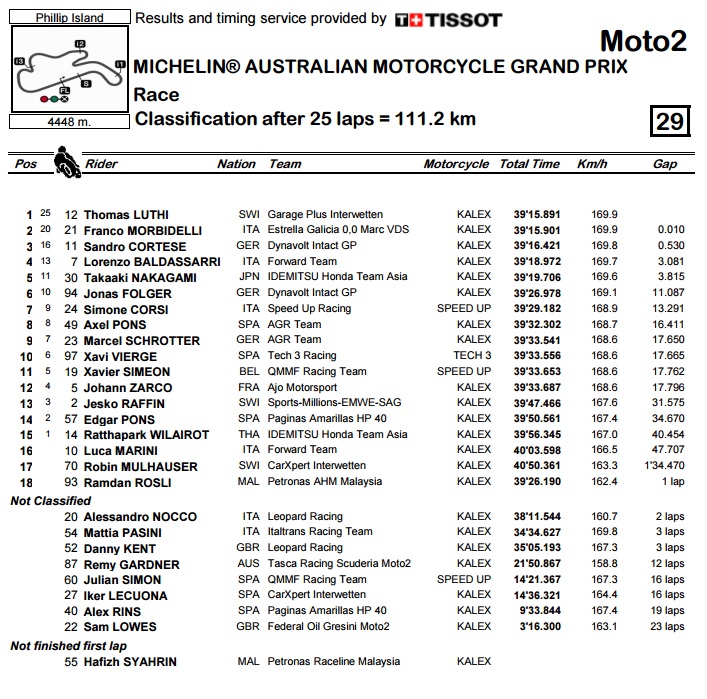Moto2 utrka je bila zanimljiva iz nekoliko aspekata. Prvenstveno zbog toga što je odlučena foto finišem, koji je pokazao da je Luthi pobijedio Morbidellija za 1 stotinku, dok je trećeplasirani Cortese prošao ciljem pola sekunde kasnije. No, Phillip Island je bio zanimljiv i zbog borbe za naslov prvaka, kojoj se još uvijek ne nazire rasplet.