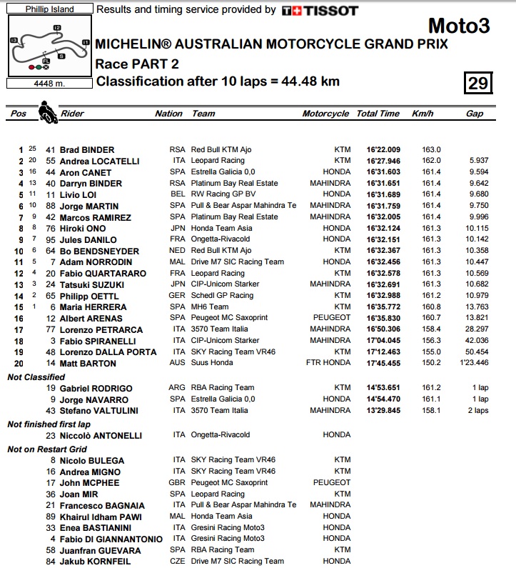 Moto3 utrka je ponudila sveopći kaos i mnoštvo padova. Zbog jednog grupnog pada je došlo i do prekida, nakon čega je druga utrka skraćena na samo 10 krugova. U takvom sprintu je novi prvak Brad Binder bio klasa za sebe, pobijedivši sa čak 6 sekundi prednosti ispred Locatellija, dok je u masovnoj borbi za treće mjesto Aron Canet u posljednji trenutak probio ispred Bradovog mlađeg brata Darryna Bindera. O kakvoj je utrci bila riječi svjedoči i to da je Philipp Oetl za trećeplasiranim Canetom kasnio samo nešto više od sekunde, a svejedno je završio na tek 14. mjestu.