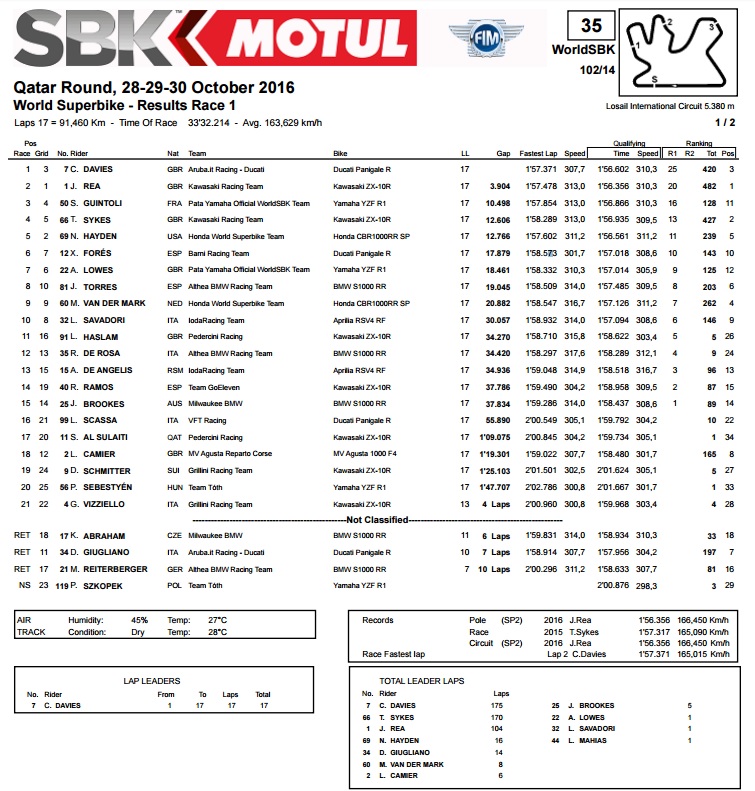 Od ostalih stvari vrijedi spomenuti da je pretprošlogodišnji prvak Guintoli u subotnjoj utrci završio kao treći i tako donio prvi podij Yamahi otkad se taj proizvođač vratio u prvenstvo. U nedjelju je završio kao 4. i tako vrlo dobro zaokružio svoj možda posljednji vikend u tom prvenstvu budući je trenutno relativno izgledno da bi mogao završiti u britanskom Superbike prvenstvu. Tamo je već ove godine završio Haslam, koji je u Kataru nastupio s pozivnicom i nakon 11. mjesta u subotu završio kao 5. u nedjelju.