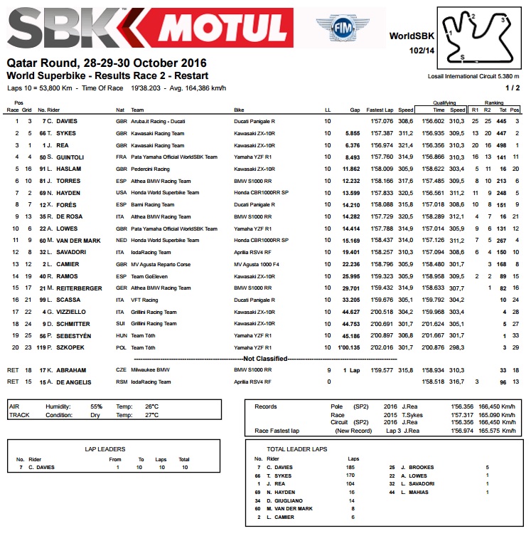 Naime, u subotnjoj utrci je slavio Davies s Ducatijem i tako se približio na samo 7 bodova Sykesu koji je završio 4. I u nedjelju je Davies je krenuo odlučno, a planove mu nije pokvario ni plamteći Kawasaki domaćeg vozača Al Sulaiti, koji je prekinuo utrku. Nakon čišćenja staze se vozio sprint od samo 10 krugova u kojem je Davies ponovo bio najbolji.