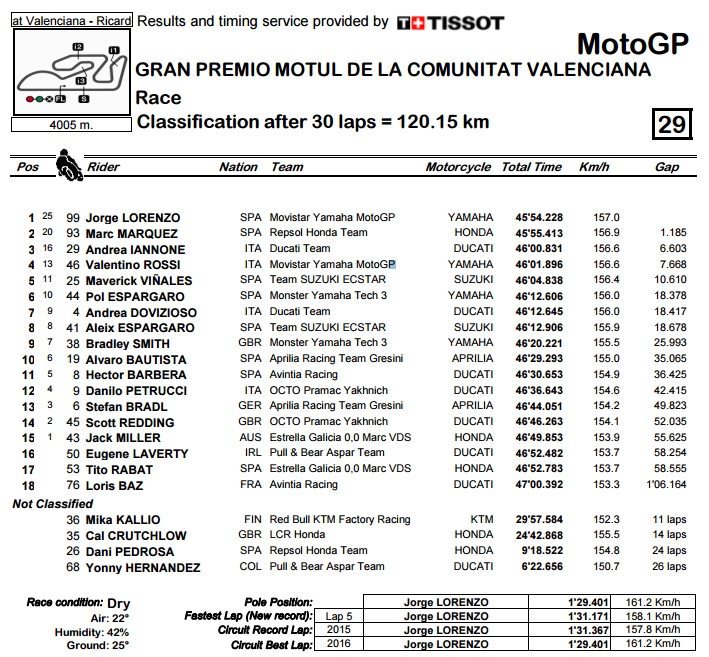 Nakon što čak 11 uzastopnih utrka nije bio čak ni blizu pobjede, Lorenzo je posljednju utrku sezone, i posljednju za upravljačem Yamahe, odradio baš u svom robotiziranom stilu. U Valenciji je bio najbrži na kvalifikacija, glatko poveo u utrci i, ne pogriješivši putanju za centimetar, u svakom od prvih 20 krugova povećavao svoju prednost za barem koju desetinku.