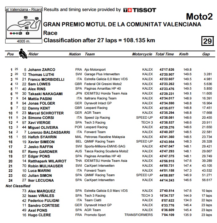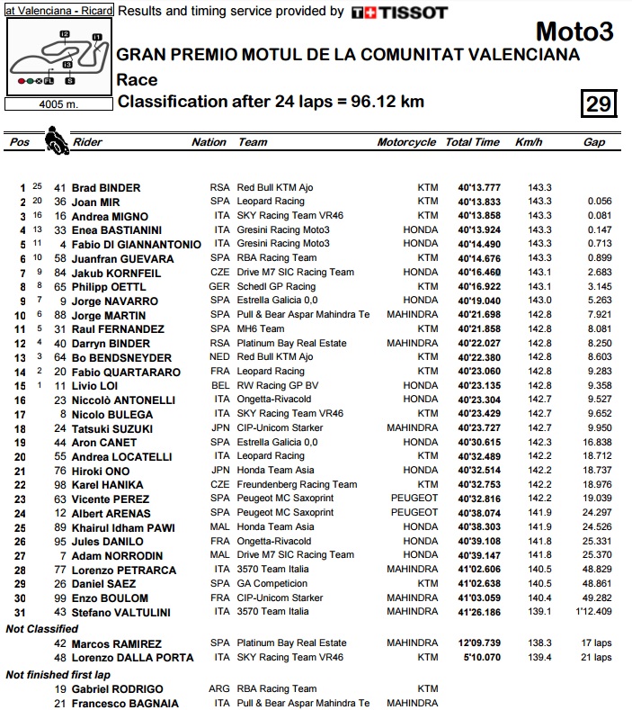 Način na koji je Južnoafrikanac Brad Binder došao do pobjede u Valenciji ne ostavlja mjesta ni trunčici sumnje da je sasvim zasluženo Moto3 prvak. Nakon što je ranije ove sezone u Jerezu startao sa zadnje pozicije i svejedno pobijedio, ovaj put je u ranoj fazi utrke potonuo s 22. mjesto, pa se probio do druge pozicije, pa pogriješio, pa se s 4. pozicije sjurio naprijed i pobijedio Mira za samo 56 stotinki sekunde, dok je Migno bio dodatne 25 stotinke sporiji. Iduće sezone Binder prelazi u klasu Moto2 gdje će voziti novi KTM-ov motocikl.