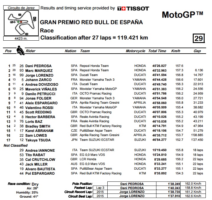 Na izlizanom i svaku minutu sve toplijem asfaltu u španjolskom Jerezu svi su MotoGP vozači imali problema s držanjem guma, posebno prednje, pa tako i Pedrosa. No, Španjolac je svejedno vodio cijelu utrku, najbolje krenuvši s prve pozicije i cijelo vrijeme držeći timskog kolegu Marqueza na odstojanju od barem sekunde. Zahvaljujući i tome što je zbog svoje manje težine, ali i stila vožnje, blaži prema gumama, Pedrosa je završnici bio dovoljno brz da se odvoji od Marqueza i tako u tri tisućitoj GP utrci svih vremena dođe do svoje tridesete MotoGP pobjede, kao i stote MotoGP pobjede za momčad Repsol Honda.