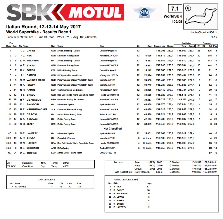 Ako već nije uspio doći do dvije pobjede u Aragonu, kako je planirao, Davies je svakako znao iskoristiti empirijsku dokazanu činjenicu da staza u Imoli domaćinski favorizira Ducati. Tako su u subotnjoj utrci dosad dominantni Rea i njegov vjerni Kawasaki već u 12. krugu kasnili skoro 7 sekundi, nakon čega je utrka prekinuta zbog pada Lavertyja čija je Aprilija nestala u spektakularnom plamenu.