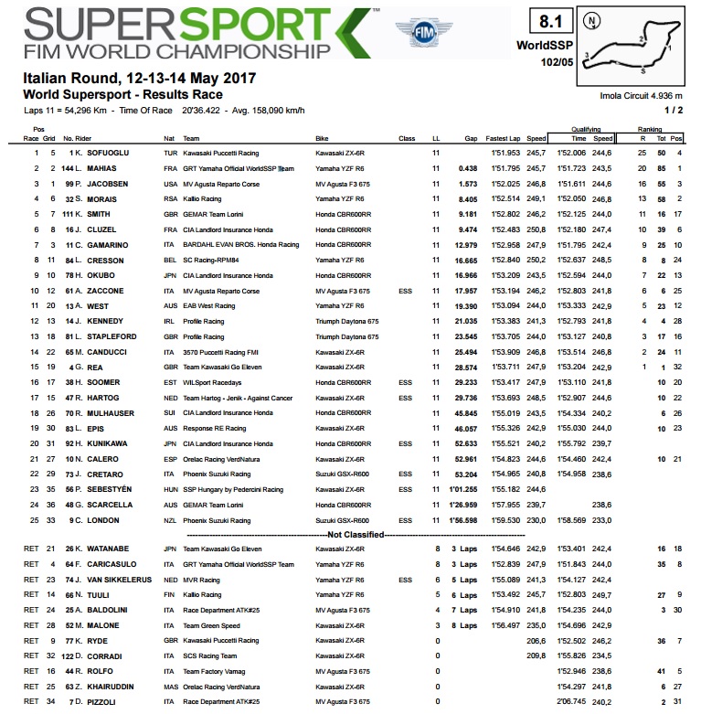 Iako je prve dvije utrke propustio zbog ozljede, a u trećoj bio srušen, Sofuoglu se pobjedama u Assenu i Imoli već probio do 4. mjesta u ukupnom poretku te ga samo 8 bodova dijeli od drugog mjesta. No, puno važnije mu je to da za vodećim Mahiasom zaostaje još uvijek dostižnih 35 bodova.