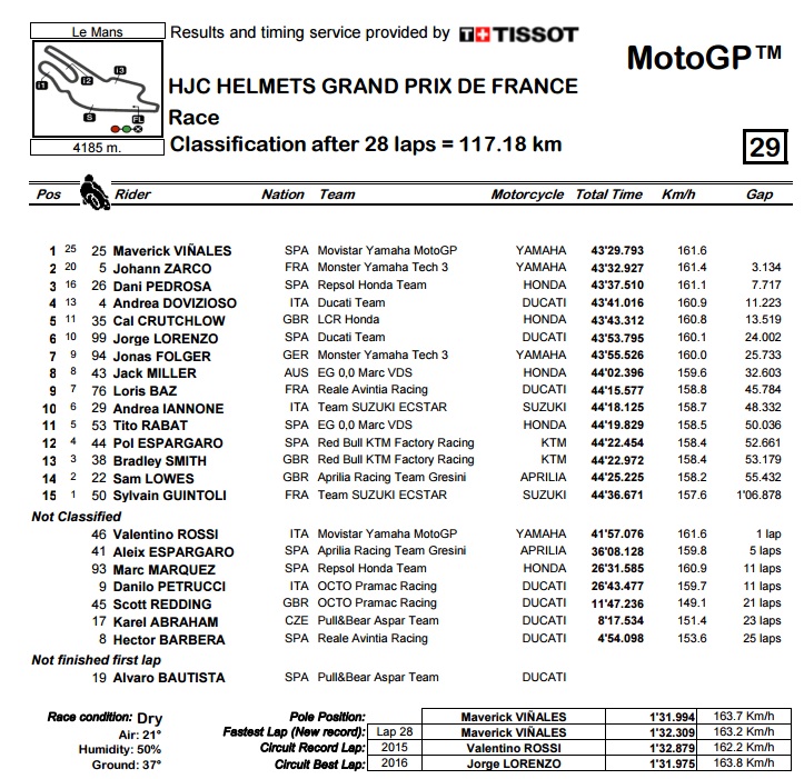 U svakom slučaju, Vinales je zasluženo pobijedio, već treći put u pet utrka s Yamahom, s time da je u zadnjem krugu oborio i rekord staze. Međutim, nakon takvog antiklimaksa s Rossijem, najveća zvijezda je bio sjajan Zarco koji je pred domaćom, francuskom publikom u žestokom ritmu odvozio cijelu utrku s mekim gumama i osvojio drugo mjesto, te se tako prvi put u tek započetoj MotoGP karijeri popeo na podij. Padove Rossija, ali i Marqueza ispred njega, iskoristio je Pedrosa koji se s 13. startne pozicije probio do trećeg podija zaredom i time došao do drugog mjesta u ukupnom poretku.
