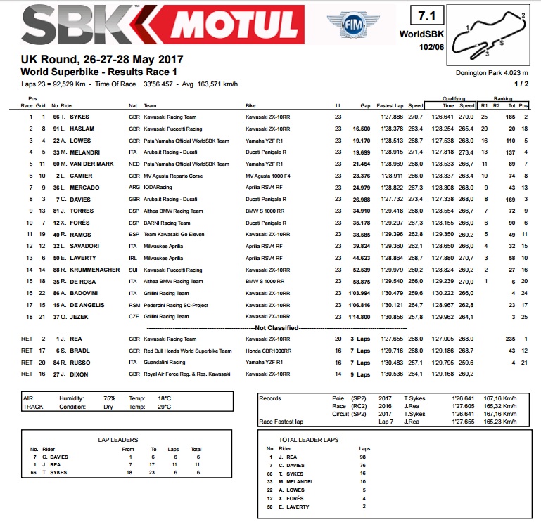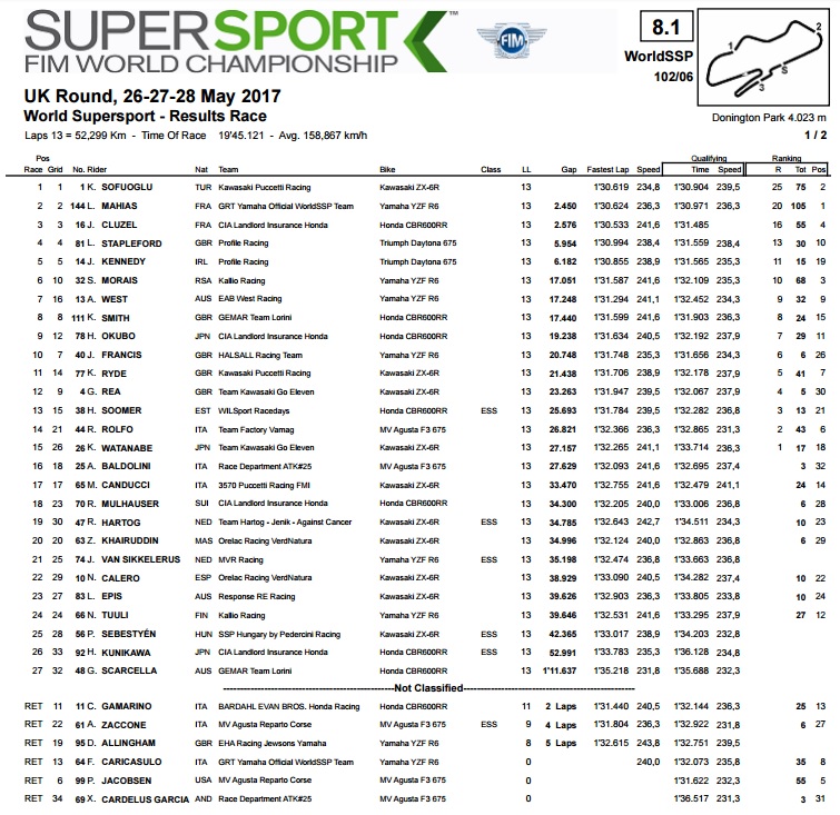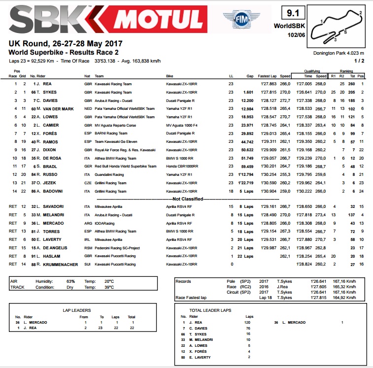 Sykes je tako došao do 9. uzastopne pobjede na Doningtonu, dok je drugo mjesto, sa 16,5 sekundi zaostatka, pripalo već umalo zaboravljenom, ali očito još uvijek brzom Leonu Haslamu, koji već neko vrijeme nastupa u britanskom SBK prvenstvu, a ovdje se pojavio s pozivnicom, za upravljačem Puccetti Kawasakija. U borbi za treće mjesto Alex Lowes je s Yamahom bi malo brži od Melandrija s Ducatijem, te se tako pobrinuo da Britanci na domaćem terenu okupiraju pobjedničko postolje. Peti je bio Vd Mark na drugoj Yamahi, šesti Camier s MV Agustom, sedmi Mercado s Aprilijom, dok se Davies uspio vratiti u utrku i skupiti prstohvat bodova za 8. mjesto.