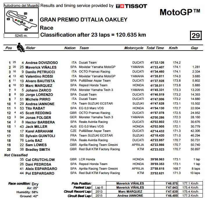 I Petrucci se u jednom trenutku uspio probiti ispred Vinalesa, ali je i malo previše potrošio gume, tako da je na kraju sa svojim Ducatijem završio kao treći, što je bio dovoljan razlog da pusti suzu na pobjedničkom postolju. Ozlijeđenom Rossiju je u završnici utrke ponestalo snage tako da je odnio bodove za 4. mjesto, a odličan dan za Ducati potvrdio je i Bautista koji je uspio odoljeti napadima i proći ciljem kao 5., s prednošću od samo 8 stotinki sekunde u odnosu na Marqueza. Zarco može biti zadovoljan 7. mjestom, za razliku od Lorenza koji je na kraju završio kao tek 8., malo ispred Ducatijeva test vozača Pirroa. Iannone je sa Suzukijem zaključio poredak prve desetorice, dok je Pedrosa u zadnjem krugu, i u borbi za tek 11. mjesto, pao i srušio Crutchlova, zaokruživši tako loš dan za Hondu.