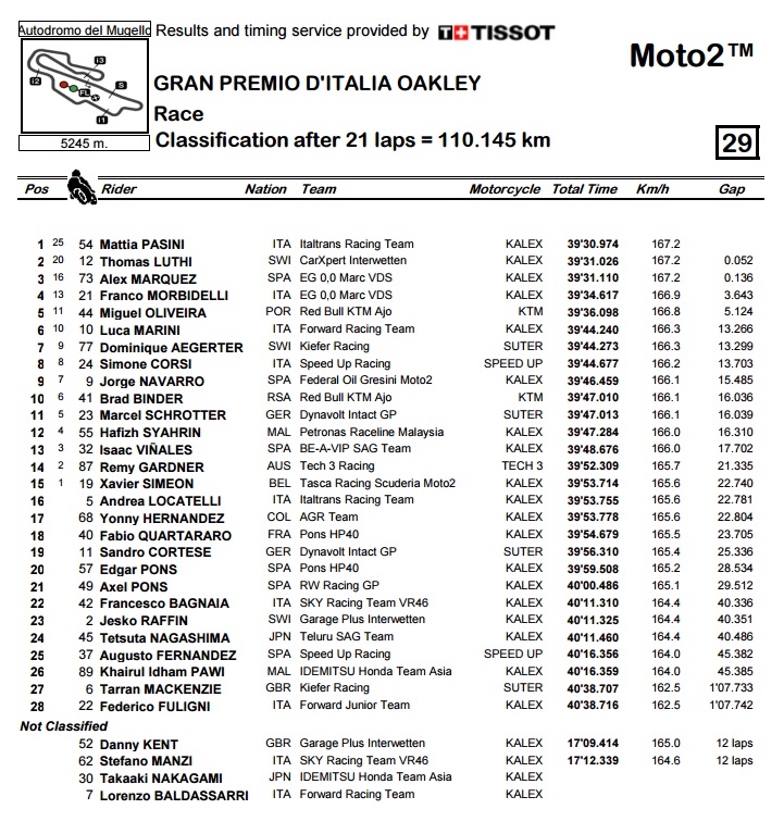 U Moto2 klasi su praktično sve nade talijanskih navijača bile na ramenima Morbidellija, no on ovaj put nije mogao bolje od četvrtog mjesta. Borba za pobjedu se odvijala između trojice vozača, koju je većinu vremena predvodio Mattia Pasini. Na kočenju u prvi zavoj zadnjeg kruga je potonuo na treće mjesto, no onda se u svoja dva omiljena vezana zavoja u jednom potezu ponovo probio naprijed i tu ostao do samog kraja. U svojoj iznimno dugačkoj Moto2 karijeri, Pasini nikad nije stajao ni na podiju, a sada je došao do pobjede sa samo 5 stotinki prednosti u odnosu na Luthija, kao još jednog veterana, dok je Alex Marquez možda malo previše kalkulirao u zadnjem krugu i tako završio treći.