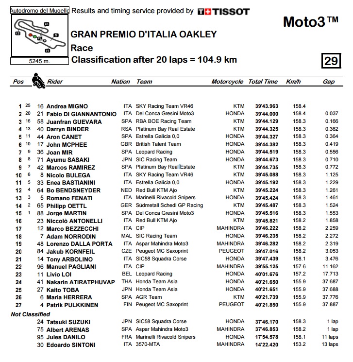 Sve je započelo tradicionalno neizvjesnom Moto3 utrkom, koju najbolje opisuje podatak da je Jorge Martin zaostao samo 1,5 sekunde za pobjednikom, a svejedno stavio u džep samo 1 bod za 15. mjesto. Iako je nakon izlaska na ciljnu ravnicu njegovu zavjetrinu ulovio sunarodnjak Di Giannatnonio s Hondom, Mingo je ipak nekako zadržao prednost od samo 37 tisućinki sekunde i tako došao do pobjede, prve u svojoj karijeri i prve za KTM u ovoj sezoni. Štoviše KTM do te utrke još nije bio na pobjedničkom postolju, a u Mugellu su imali i Guevaru na trećom mjestu, dok su poredak prve petorice zaokružili D. Binder (KTM) i Canet (Honda).