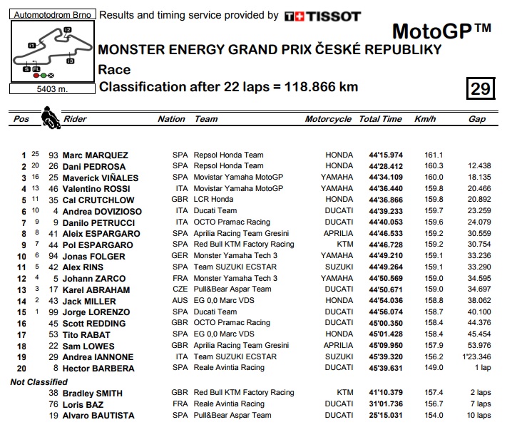 Iako borbe za pobjedu nije ni bilo, utrku u Češkoj je zanimljivom činio proboj tvorničkih vozača Yamahe. Obojica su nakon kaosa s odlaskom u boks bili debelo izvan prve desetorice, no Vinales se do kraja utrke probio do trećeg mjesta, dok je Rossi u samoj završnici obišao Crutchlowa i osvojio bodove za četvrtu poziciju. Dovizioso je utrku završio kao šesti, što sve znači da su se i malo povećali razmaci između prve četvorice u ukupnom poretku, koji su dosad bili ugurani unutar 10 bodova. Tako Marquez sada ima 14 bodova više od Vinalesa, 21 više od Doviziosa i 22 više od Rossija, što još uvijek garantira neizvjesnost, utoliko više što i peti Pedrosa zaostaje dohvatljivih 31 bodova.
