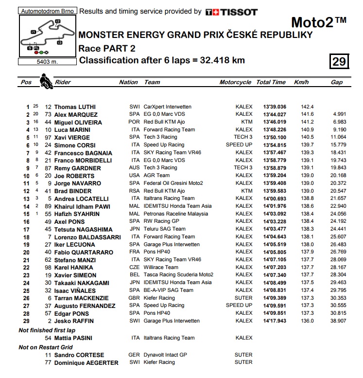 Moto2 utrka je prekinuta zbog kiše, nakon čega je uslijedio ponovljeni start i sprint od samo 6 krugova, sa startnom rešetkom formiranom po redoslijedu kojim su vozači završili prvi dio utrke. To znači da je Luthi imao tek 7. startnu poziciju, ali je odlično krenuo i odmah se probio u vodstvo, nakon čega je odjurio naprijed i pobijedio sa zalihom od skoro 5 sekundi u odnosu na drugoplasiranog Alexa Marqueza. Oliveira je s KTM-om bio treći, dok se Morbidelli nije baš najbolje snašao u tom kaotičnom sprintu te je utrku završio kao 8. Takvim raspletom se donekle zgusnuo poredak na samom vrhu i Morbidelli ima samo 17 bodova više od Luthija, dok su Marquez i Oliveira smanjili zaostatak na još uvijek velikih 49 bodova.