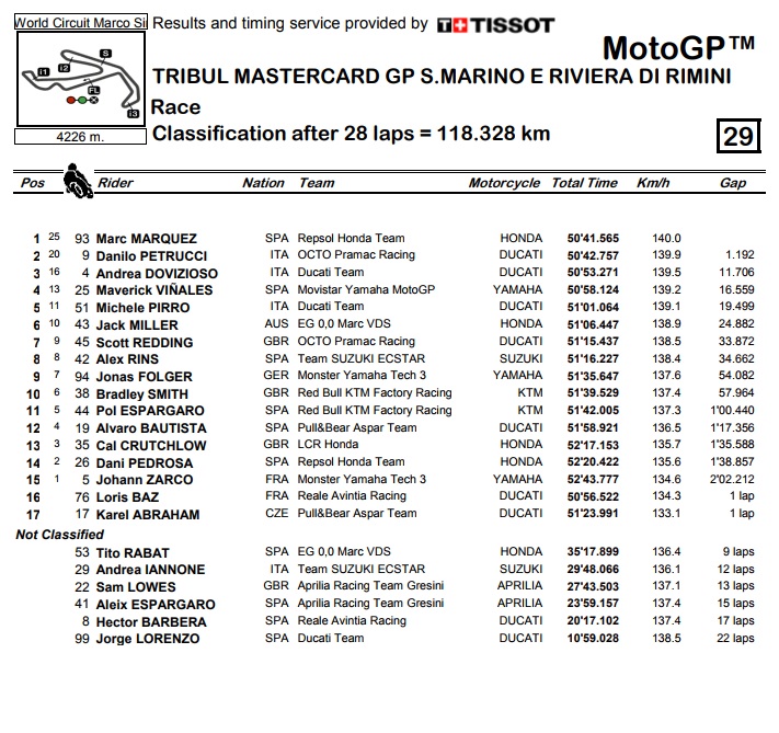 Rossi je sa slomljenom nogom propustio utrku, dok Pedrosa do pred sam kraj nije mogao dovoljno zagrijati gume, tako da su njih dvojica realno ispali iz utrke za naslov prvaka. Ali Vinales je s Yamahom i dalje u igri. Iako nije specijalist za vožnju po kiši, utrku je završio kao 4., pa je tako njegov zaostatak za vodećim (dvojcem) narastao sa 13 na 16 bodova, što je itekako dostižno u situaciji kad se može osvojiti 125 bodova do kraja sezone.