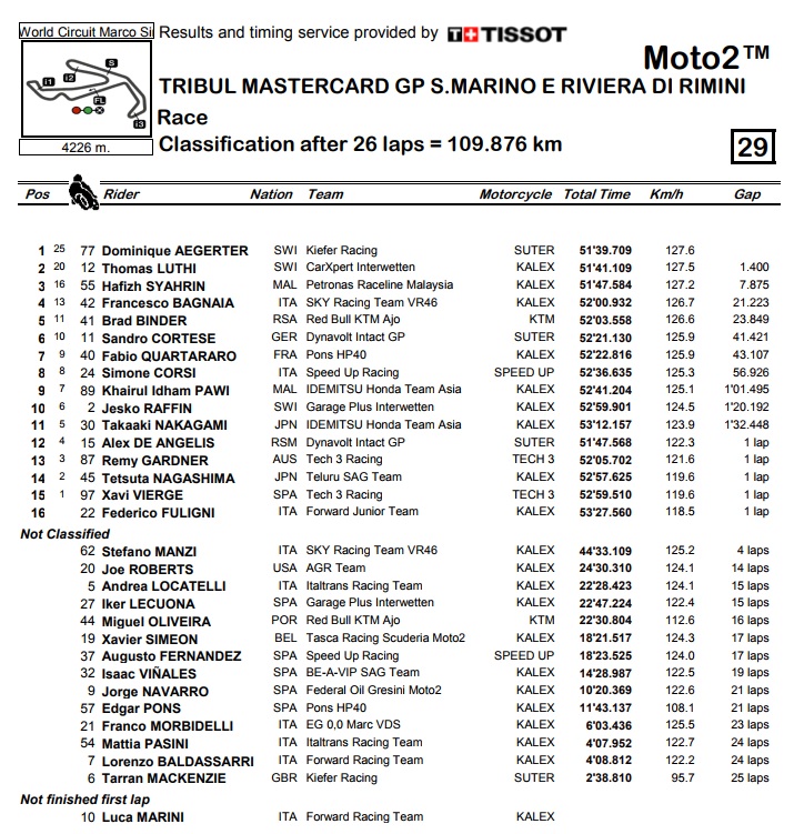 U klasi Moto2 je jaka kiša bitno zakomplicirala situaciju na samom vrhu. Drugi put ove sezone Morbidelli je pao u trenutku kad je vodio, nakon čega je vodstvo preuzeo Aegerter. Nakon jedne njegove greške Luthi je preuzeo vodstvo, no na samo nekoliko metara, nakon čega je samo stidljivo napadao, nesklon pretjeranom riziku. Na kraju je Aegerter postao prvi vozač koji je pobijedio sa Suter motociklom od kraja 2014. godine, dok se Luthi osvajanjem drugog mjesta primakao na samo 9 bodova zaostatka za Morbidellijem. U utrci u kojoj samo 9 vozača nije barem jednom palo, uz dvojicu Švicaraca na pobjedničkom postolju je stajao i Malezijac Syahrin, četvrti je bio Bagnaia s još jednim Kalexom, dok je 5. mjesto dograbio Binder s KTM-om.