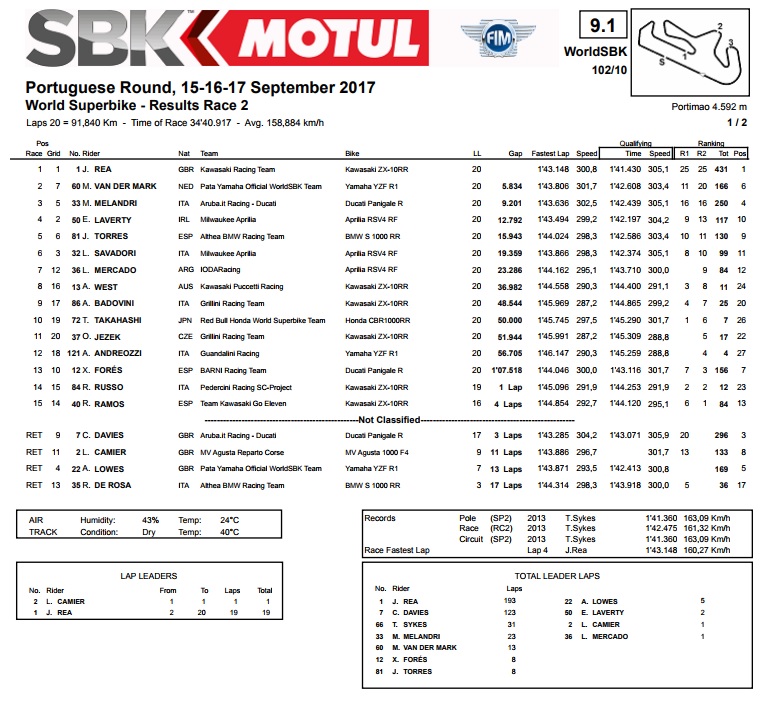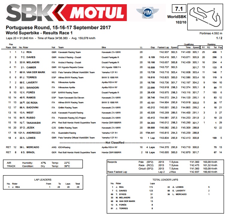 Sykes je na stazi Portimao pao još na treningu, slomio dva prsta i zapešće te završio na operaciji. Davies je bio drugi u subotnjoj utrci, pa ničim izazvan pao u nedjelju, dok je Rea nastupao po svom uobičajenom programu i odnio dvije glatke pobjede.