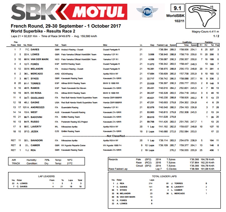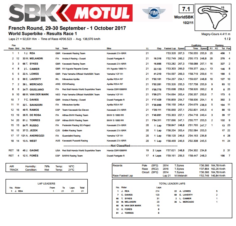 Kao što se i očekivalo, okupljanje u francuskom Magnyu Coursu je bilo samo stvar formalnosti za starog i novog prvaka. Rea je već na subotnjoj utrci mogao postati prvakom i na najbolji način je iskoristio tu prvu meč loptu. Ne samo da je pobijedio, nego je to učinio s prednošću od čak 16 sekundi, što je sasvim u skladu s dominacijom koju je prikazivao tijekom cijele ove sezone. Uostalom, bila je to njegova 12. ovogodišnja pobjeda, ujedno i jubilarna 50. u karijeri te 35. u protekle tri sezone otkad je za upravljačem Kawasakija. Ako vas to zanima, u borbi za drugo mjesto, Melandri je s Ducatijem bio mrvicu bolji od još nezaliječenog Sykesa na Kawasakiju.