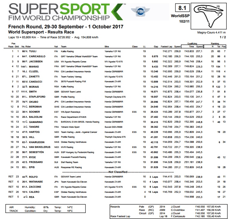Za Kawasaki se nemalo zakomplicirala situacija i u Supersport prvenstvu. Taman kad je preuzeo vodstvo u ukupnom poretku, Sofuoglu je pao na kvalifikacijama i slomio kuk, zbog čega je bio prisiljen propustiti utrku. Jedina dobra vijest za njega je da Mahias s Yamahom nije mogao bolje od četvrtog mjesta, pa tako vozač Kawasakija dvije utrke prije kraja zaostaje samo 9 bodova. No, ostaje za vidjeti hoće li se Turčin stići vratiti na stazu do kraja sezone i u kakvom stanju. Inače, u Magny Courseu je do svoje prve pobjede došao finski vozač Tuuli s nepunu sekundu prednosti u odnosu na Caricasula, obojica na Yamahama, dok je treći bio Jacobsen na MV Agusti.