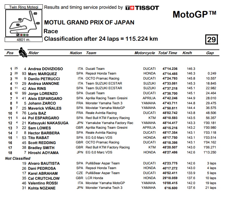 Bio je to sličan potez onom na nedavnoj utrci u Austriji, a isti je bio i rezultat. U tom ambicioznom pokušaju pretjecanja Marquez je otišao preširoko, Dovizioso se provukao ispred njega i došao do pete pobjede ove sezone. Isti broj pobjeda ima i Marquez te u posljednje tri utrke sezone ulazi s prednošću od samo 11 bodova. Istovremeno su obojica još malo odmaglili Vinalesu, koji je cijeli vikend imao problema s držanjem stražnje gume na svojoj Yamahi i završio kao tek 9. te sad ima 33 boda manje od Marqueza. Rossi je pao i tako ispao iz svih kombinacija za naslov, dok je Pedrosa još samo teoretski ostao u igri nakon što je odlučio odustati zbog toga što mu se stražnja guma vrtjela u prazno.