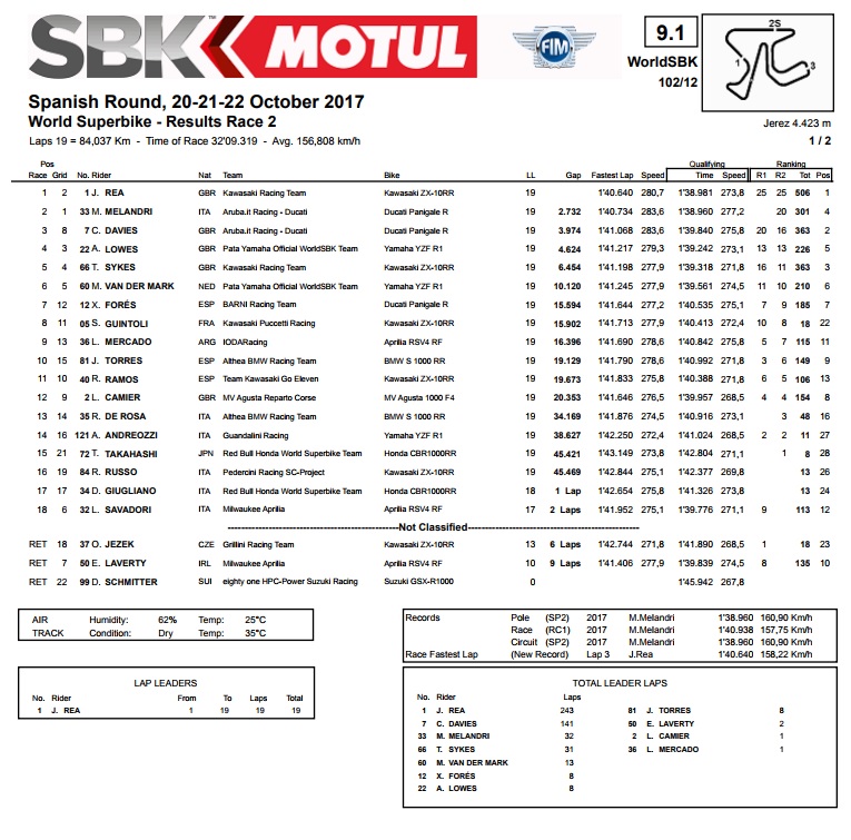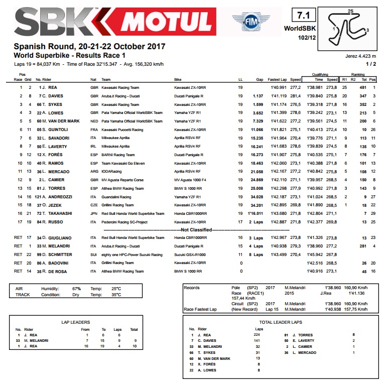 I nakon što je potvrdio osvajanje treće uzastopne krune, Rea nastavlja nesmanjenom žestinom dominirati Superbike prvenstvom. Doduše, vozač Kawasakija je do svoje prve pobjede na stazi Jerez došao tek nakon što je dotad vodeći Melandri upao u tehničke probleme s Ducatijem i morao odustati. Drugo mjesto je pripalo Daviesu na drugom Ducatiju, a treće Sykesu na drugom Kawasakiju, s time da su sva trojica završila utrku unutar dvije sekunde.