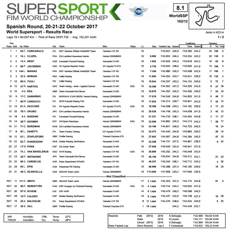 Treće mjesto je dograbio povratnik West, koji upravlja Sofuoglovim Kawasakijem, dok je četvrti bio Jacobsen na MV Agusti. Yamaha je potvrdila osvajanje konstruktorskog naslova u klasi Supersport 600, a vozač Yamahe Marc Garcia je u Jerezu postao prvi prvak nove klase Supersport 300.