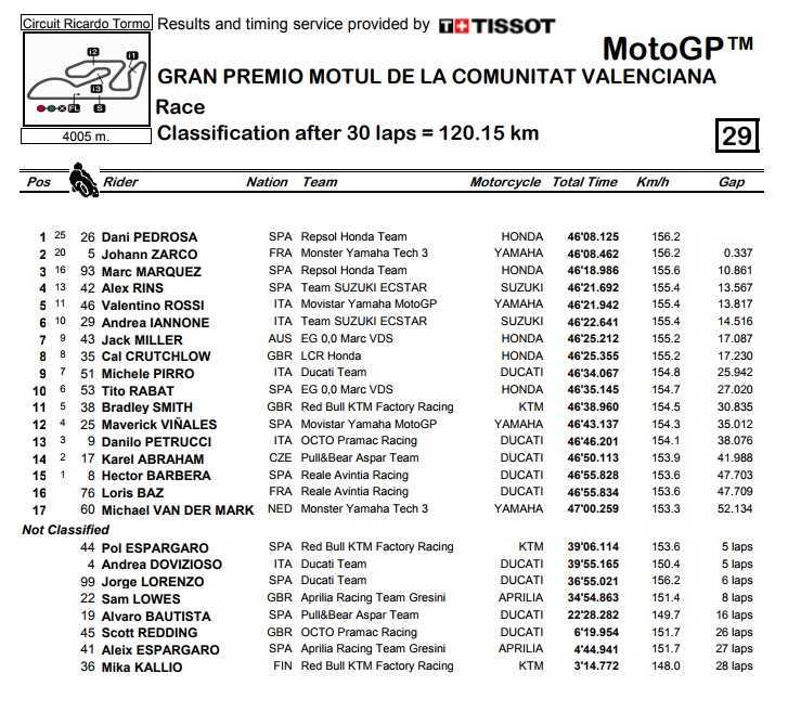 I tu je konačno sve bilo riješeno, Marquez je došao do svoje četvrte MotoGP krune u samo 5 sezona, odnosno ukupno 6. naslova prvaka u samo 8 godina. Nakon što je posrnuo Ducatijev dvojac, ciljem je prošao treći, dok je njegov timski kolega Pedrosa na ulasku u posljednji krug napao Zarca, pritom ga i lukavo blokirao i otišao do druge pobjede ove sezone.