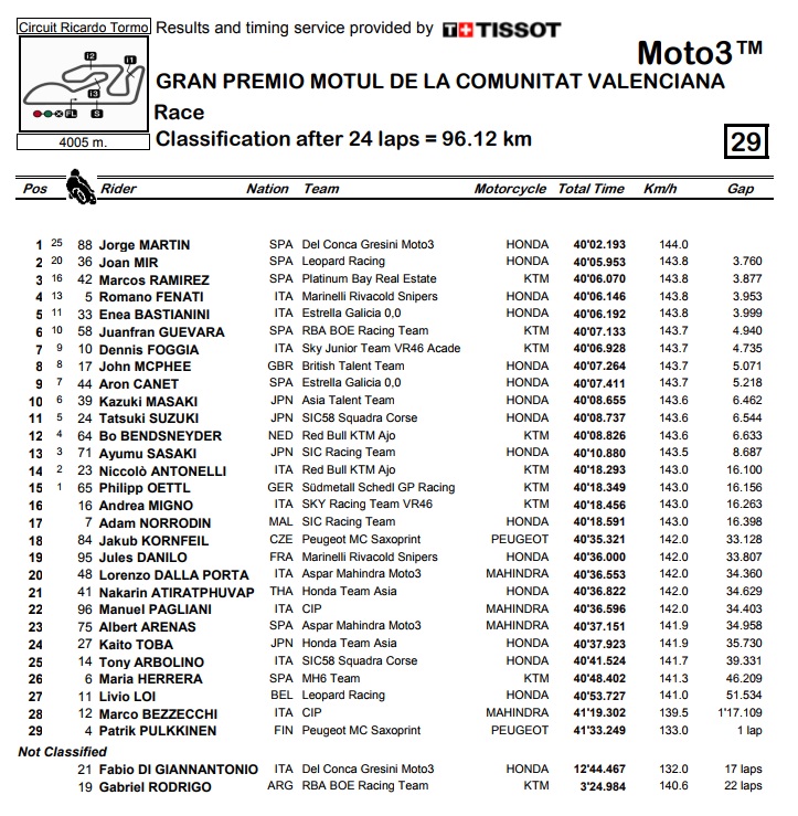 U klasi Moto3 se već neko vrijeme zna da je Joan Mir novi svjetski prvak, no to ga nije spriječilo da odvozi još jednu utrku za pamćenje. Istina, nije pobijedio, ali se - nakon što je sletio sa staze kad je ispred njega pao Rodrigo – probio s 19. pozicije na 2. mjesto. Njegovo izlijetanje je pomoglo Martinu da konačno dođe do svoje prve i davno zaslužene pobjede, a iza dva vozača Honde ciljem je prošao Ramirez, koji je tako potvrdio da je ove godine bio najbolji vozač u ovoj klasi posrnulog KTM-a.