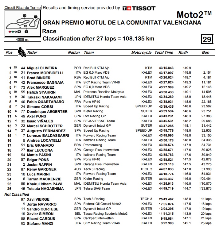 No, ako je KTM iza sebe imao lošu Moto3 sezonu, u MotoGP klasi su sve bolji i bolji, dok su Moto2 kategoriji postali praktično nepobjedivi. Doduše, nisu bili blizu osvajanja naslova, ali je Oliviera slavio na tri posljednje utrke sezone, dok je njegov timski kolega Binder, nakon dva uzastopna druga mjesta, u Valenciji završio kao treći. Između njih dvojice se ovom prilikom ugurao Franco Morbidelli, koji je već imao naslov u džepu.