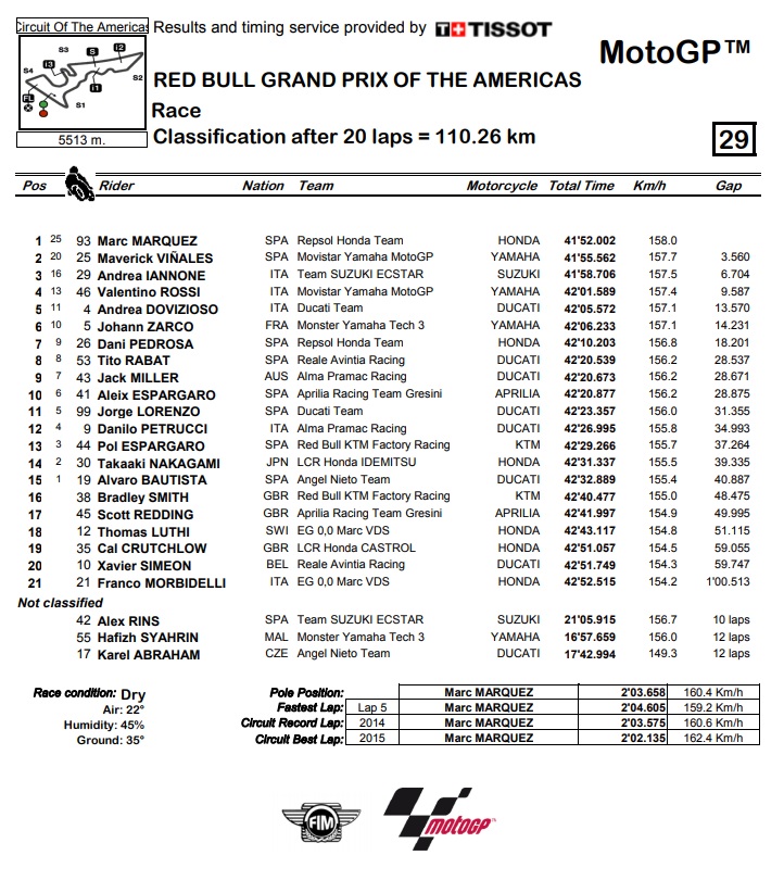 Iako je zbog sitnog incidenta na kvalifikacijama bio pomaknut s prve na četvrtu poziciju, Marquez je već do polovice uvodnog kruga preuzeo vodstvo. Nešto kasnije se Iannone uspio ponovo pogurnuti naprijed, no Marquez mu je uzvratio u roku od nekoliko sekundi, nakon čega ga više nitko nije vodio. Na dugačkoj i izuzetno grbavoj stazi Circuit of The Americas, na kojoj je oduvijek klasa za sebe, Marquez je držao nevjerojatan tempo te je glatko došao do svoje šeste MotoGP pobjede u Teksasu, a desete uzastopne na teritoriju SAD-a. Ako računamo i Moto2 utrke, Marquez na američkom teritoriju nije pobijeđen još od 2011., odnosno punih 12 utrka.