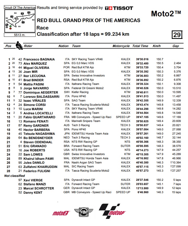 Nevjerojatnu utrku je odvozio Marquezov timski kolega Joan Mir, koji je nakon incidenta u prvom zavoju prvog kruga potonuo na 24. mjesto, da bi se aktualni Moto3 prvak, u svojoj tek trećoj Moto2 utrci, probio do 4. mjesta. Malo iza njega je ciljem prošao i perspektivni Lecuona, samo stotinku brži od Bindera na drugom KTM-u. Veteran Pasini je bio „kočničar“ u ranoj fazi utrke i na kraju je završio kao sedmi, pa je tako vodstvo u ukupnom poretku preuzeo ove godine već dvostruki pobjednik Bagnaia.