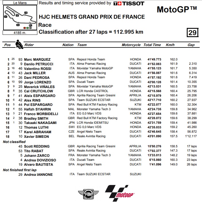 Dvostruko ozlijeđeni Pedrosa se postupno probio na 5. mjesto, dok je Lorenzo lagano potonuo na 6. poziciju. Već spomenuti Vinales je bio sedmi, a junak dana bio je Crutchlow, koji je na kvalifikacijama imao težak pad te je tek u nedjelju ujutro pušten iz bolnice da bi s potresom mozga i laganim unutarnjim krvarenjem dohvatio bodove za 8. mjesto. Aleix Espargaro s Aprilijom i Alex Rins sa Suzukijem zaključuju poredak prve desetorice.