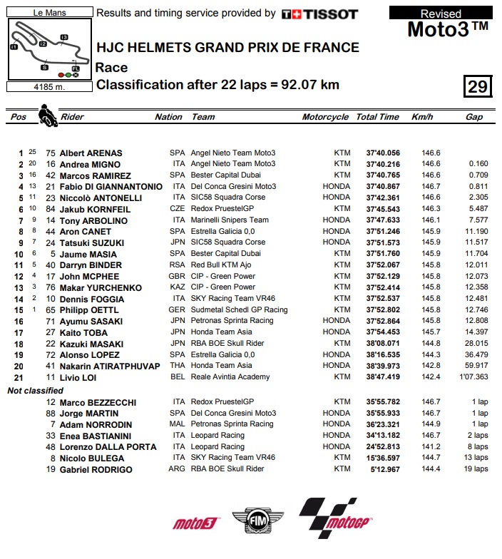 Već bi i sve to bilo vrijedno dugog pamćenja, u pretposljednjem zavoju posljednjeg kruga je uslijedila nova drama. Di Giannantonio je tijesno preuzeo vodstvo Bezzecchiju, koji nakon toga malo previše agresivno dodaje gas i biva katapultiran visoko u zrak. U njegov KTM se zaliječe Martin s Hondom, što znači da su pala dvojica vodećih u prvenstvu. I to nije sve, jer samo nekoliko trenutaka nakon što je Di Giannantonio kao prvi prošao ciljem, direkcija utrke objavljuje (predugo čekanu) odluku da je zbog ranijeg presijecanja šikane kažnjen s 2 sekunde. To znači da je Di Giannantonio spušten na 4. poziciju, pa je tako, ni krivom ni dužnom, pobjeda dodijeljena Arenasu. Drugi je bio njegov timski kolega Mingo, a treći Ramirez.